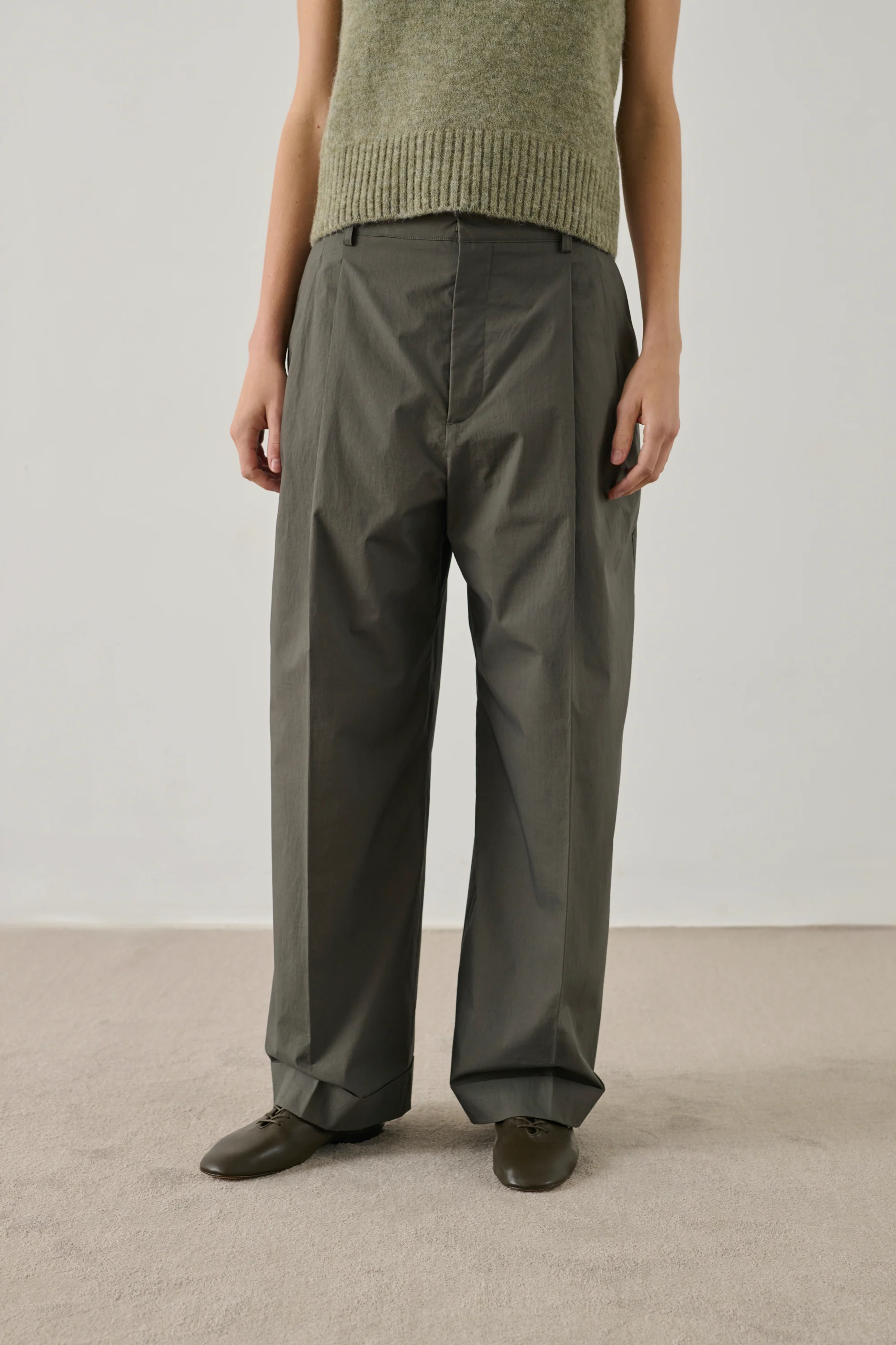 - High-waisted, wide-leg trousers